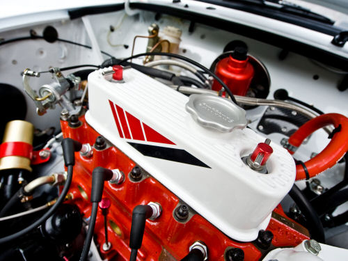INTERIOR: Nurburgring classic half leather seats, custom red headlining, Newton Commercial carpets, flocked central dash binnacle, switch panel and steering column surround, bare dash rails with matching white powdercoated heater box, pedal box and pedals. Full 4 speaker stereo system.