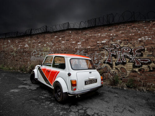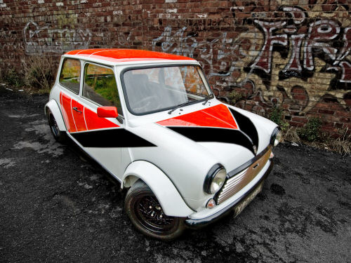 This mini started as a design concept based on the 1980 Scalextric Mini Clubman Slot Car Model, we had wondered whether the striking design of the Scalextric 1275 GT could be used on the traditional mini front. Drawings and design ideas were produced and from these the real full size item could start to come to life. As the design is based on white, red and black, we decided to incorporate these colours into other aspects of the car such as suspension, the engine bay and the interior. The car, although styled, was to have a relatively minimalist finish by hiding away extras such as the stereo system and wiring loom to give a smoother hot rod type look.A new bodyshell with doors, bootlid and bonnet were purchased along with the 1000's of other associated parts to build the car into better than new condition. The mini was dry built to ensure everything fitted so that the build up, when painted, would be exact. It is important to try everything, but it was at this stage that we needed to decide which wheels and tyres to use, as getting the clearances right so that they don't rub in use is critical. We chose Compomotive Bavarian Wheels in black with 175/50/13 tyres with a slick type profile, perfect for Scalextric! We decided to cut the front arches and also tub the rear wheelarches for more clearance. Curley Miglia type wheelarches were used to cover and were an excellent match for the model. Paintwork was carried out by our paintshop with the white being laid down first followed by the distinctive red and black design, a task not for the faint-hearted! Finally, when dry the clear coat was added for a fantastic shine.